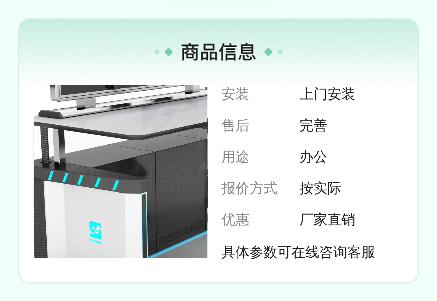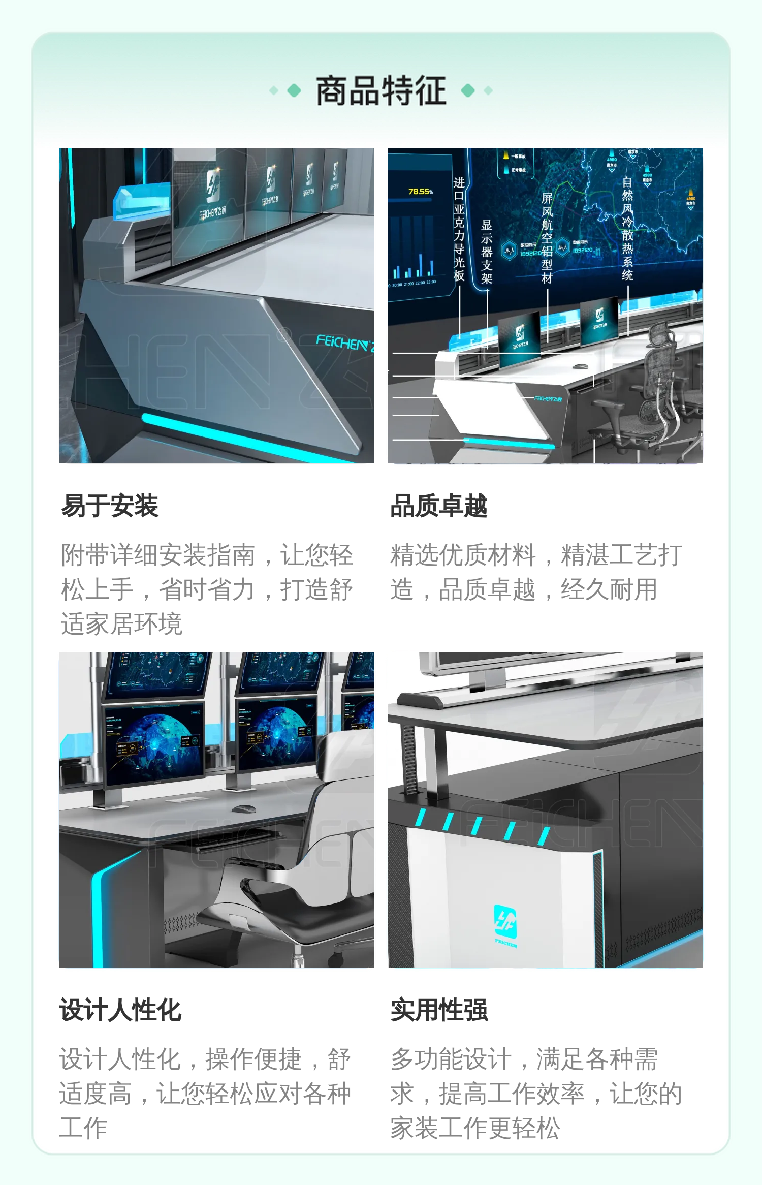 材料選擇:飛宸注重環(huán)保和耐用材料的運(yùn)用,保證設(shè)備長(zhǎng)期穩(wěn)定使用且易于維護(hù)。 線纜管理:細(xì)致的線纜布局設(shè)計(jì)減少線路混亂,提高整體安全性。 散熱設(shè)計(jì):針對(duì)電子設(shè)備的高負(fù)荷運(yùn)行,飛宸控制臺(tái)具備良好的散熱系統(tǒng),防止設(shè)備過(guò)熱故障。 智能集成:支持與第三方系統(tǒng)無(wú)縫對(duì)接,便于管控大廳實(shí)現(xiàn)數(shù)字化互聯(lián)互通。六、為什么選擇飛宸(廣東)科技有限公司的產(chǎn)品